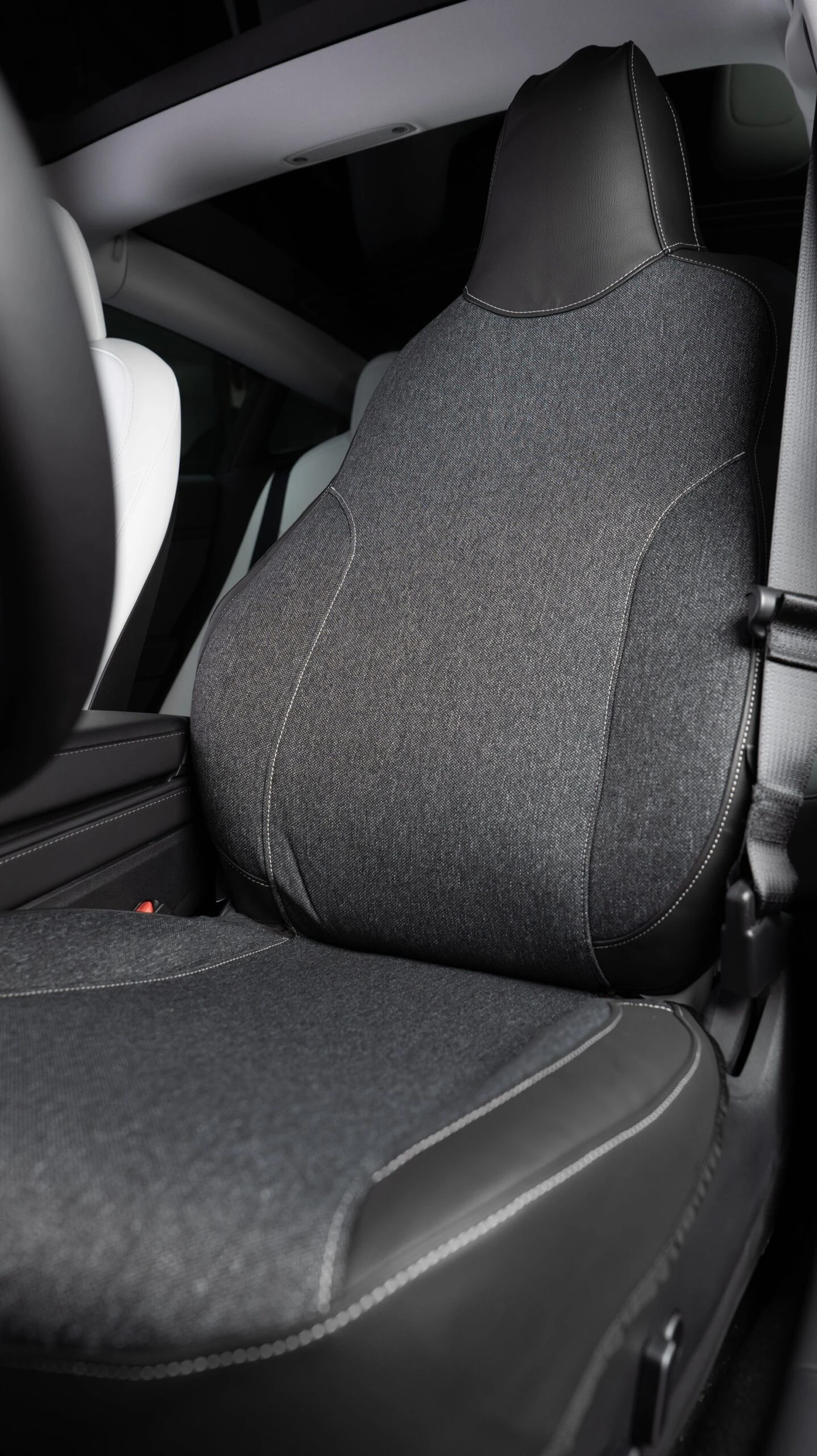 Unser 2befair Sitzbezug passt perfekt über einen der vorderen Sitze in deinem Tesla Model 3 oder Y. Hier setzten wir auf einen Recycling-Stoff in Verbindung mit Kunstleder. Der Sitzbezug bedeckt dabei die Rückenlehne vorne und Sitzfläche oben, geht aber nicht ganz nach hinten herum – die Hinterseite der Rückenlehne bleibt also frei.